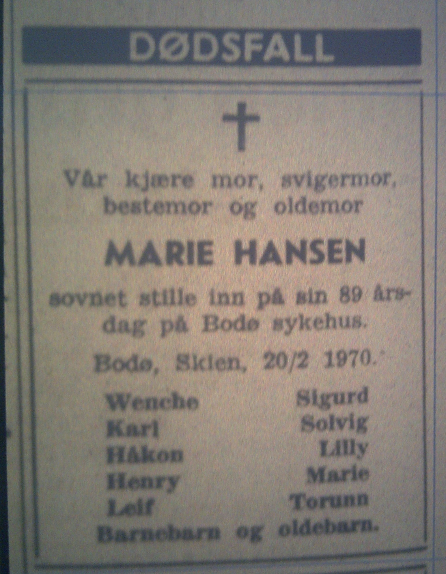 5.2: Herman Karolius Normann, f. 18.03.1895-L12. - d. (Hermann Nicolaisen - farens etternavn) 20.02.1975 - 79 år. Folketelling i 1900: Fostersønn hos tanten Henrikke. Folketelling 1910: Er 15 år og står oppført som tjenestegutt hos Johan Jensen - sønn til Henrikke. Også Henrikke bodde da hos Johan. Dødsannonsen stod i Nordlandsporten 24.02.1975. Begravet fra Domkirken Bodø (F=J, R=147, Gnr=19). Gift med Klara Elise (Akselsdatter) Henriksen (f. 23.05.1896 d. 20.02.1973)
