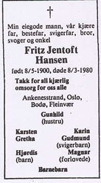 1.1.6: Fritz Jentoft Hansen. f. 08.05.1900-L32. Folketelling 1910: Bodde hjemme. Han døde 08.03.1980 79 år gammel på Akenes (Narvik). Bilde av gravsteinen. Dødsannonsen stod i "Fremover" 10.03.1980. Han var gift med Gunhild O. Hansen (07.02.1907 - 28.08.1984). Dødsannonsen til Gunnhild stod i "Fremover" 31.08.1984.