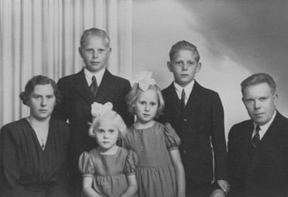 Familien i 1947: Marie, Kåre, Solveig, Astrid, Magne og Toralf